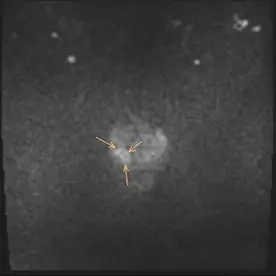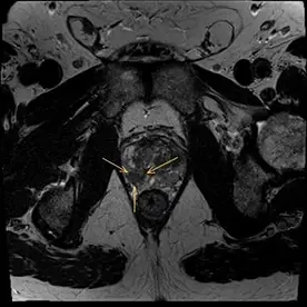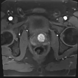 Die Läsion 1 liegt in der Transitionszone links paramedian basal und im mittleren Drüsendrittel mit einer Signalminderung in T2w (Bild 1), Diffusionsstörung (Bild 2) und Korrelat in der DCE. Die Größe der Läsion beträgt ca. 25x20x28mm, sie zeigt keine Überschreitung der Kapsel und keine Invasion in das neurovaskuläre Bündel (Bild 5). Die Läsion wurde als PI-RADS 5 klassifiziert und hat somit ein sehr hohes Malignitätsrisiko.