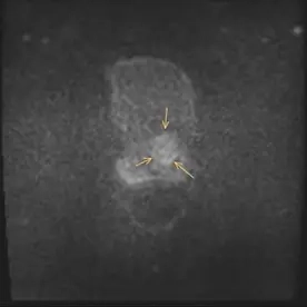 Die Läsion 2 liegt in der peripheren Zone rechts apikal mit ebenfalls niedrigem Signal in T2w (Bild 3), Diffusionsstörung (Bild 4) und Korrelat in der DCE. Diese Läsion zeigt einen Kontakt zur Kapsel. Das neurovaskuläre Bündel wird hier ebenfalls nicht infiltriert. Die Läsion wurde als PI-RADS 4 klassifiziert und zeigt damit ein hohes Malignitätsrisiko.