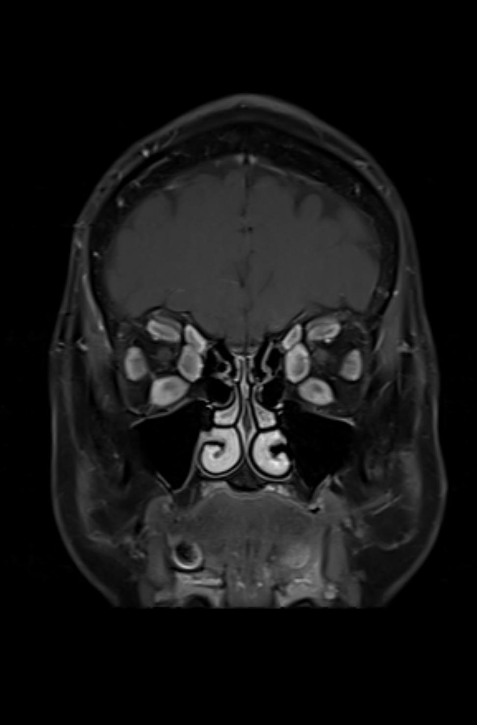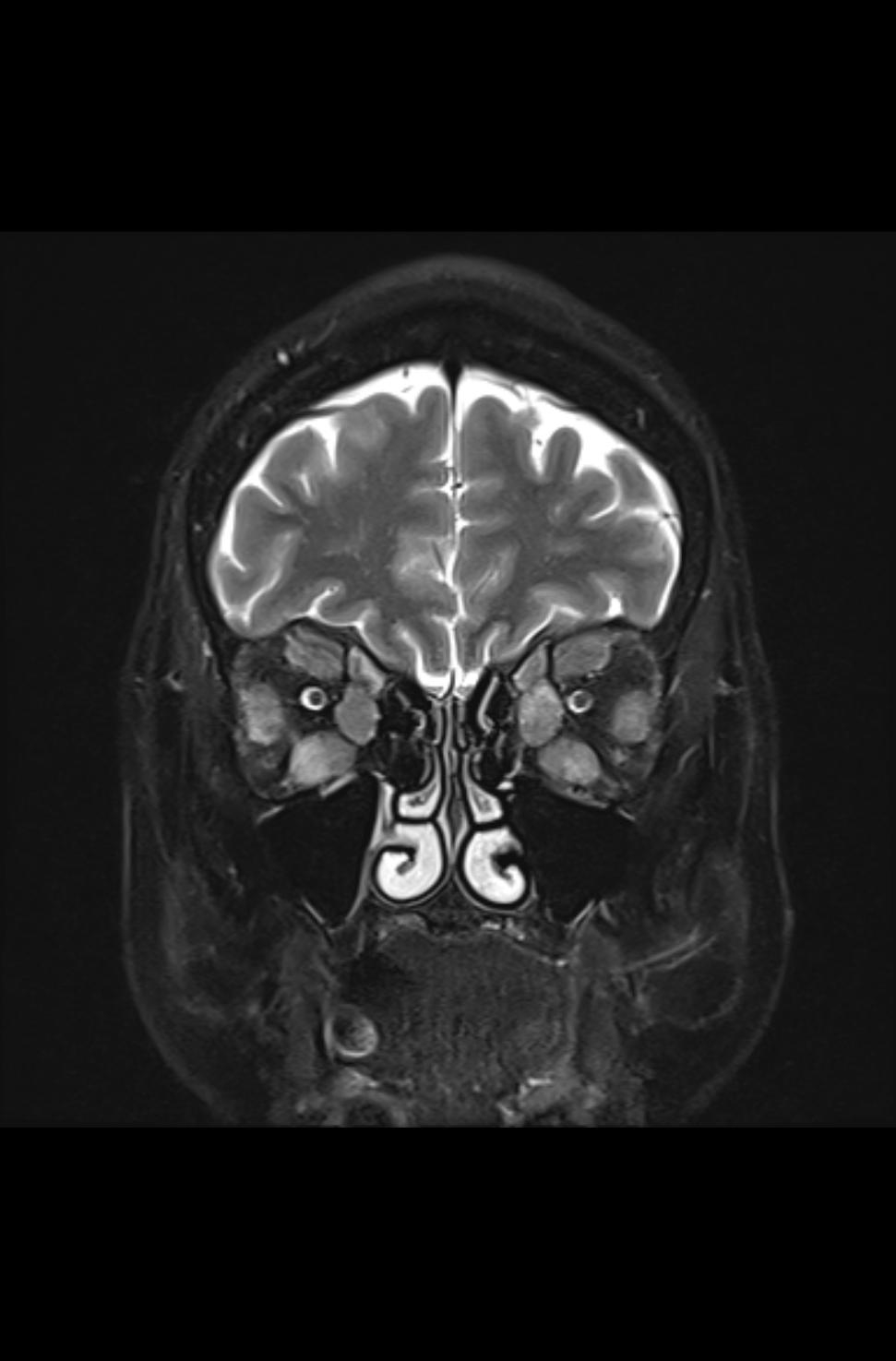 Es zeigen sich die typischen Verdickungen der Muskelbäuche der äußeren Augenmuskeln und ein Exopthalmus (Bild 3-3). In der koronaren, T2-gewichteten Sequenz mit Unterdrückung des Fettsignals (Fettsättigung) zeigt sich ein ausgeprägter Befund der endokrinen Orbitopathie mit Beteilung der Rectus-Muskeln beider Orbitae und einer Beteiligung des Musculus obliquus superior beidseits. Zusätzlich ist ein Ödem im Musculus rectus inferior beidseits, im Musculus rectus lateralis rechts, im Musculus rectus medialis links und im Musculus obliquus superior rechts abgrenzbar (Bild 3-1), welches auf eine akute entzündliche Aktivität deutet.
